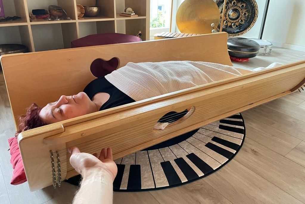 Sehr beliebt in meinem Musikzimmer ist auch die Klangwiege. Sie verhilft durch die Schwingung, die sich durch das Holz auf Ihren Körper überträgt zu einer tiefen Entspannung. Die Klangwiege nutze ich sehr gerne zu Beginn einer Stunde. Oft findet hier eine Bewußtwerdung für ein anstehendes Thema, das wir bearbeiten können, statt.
